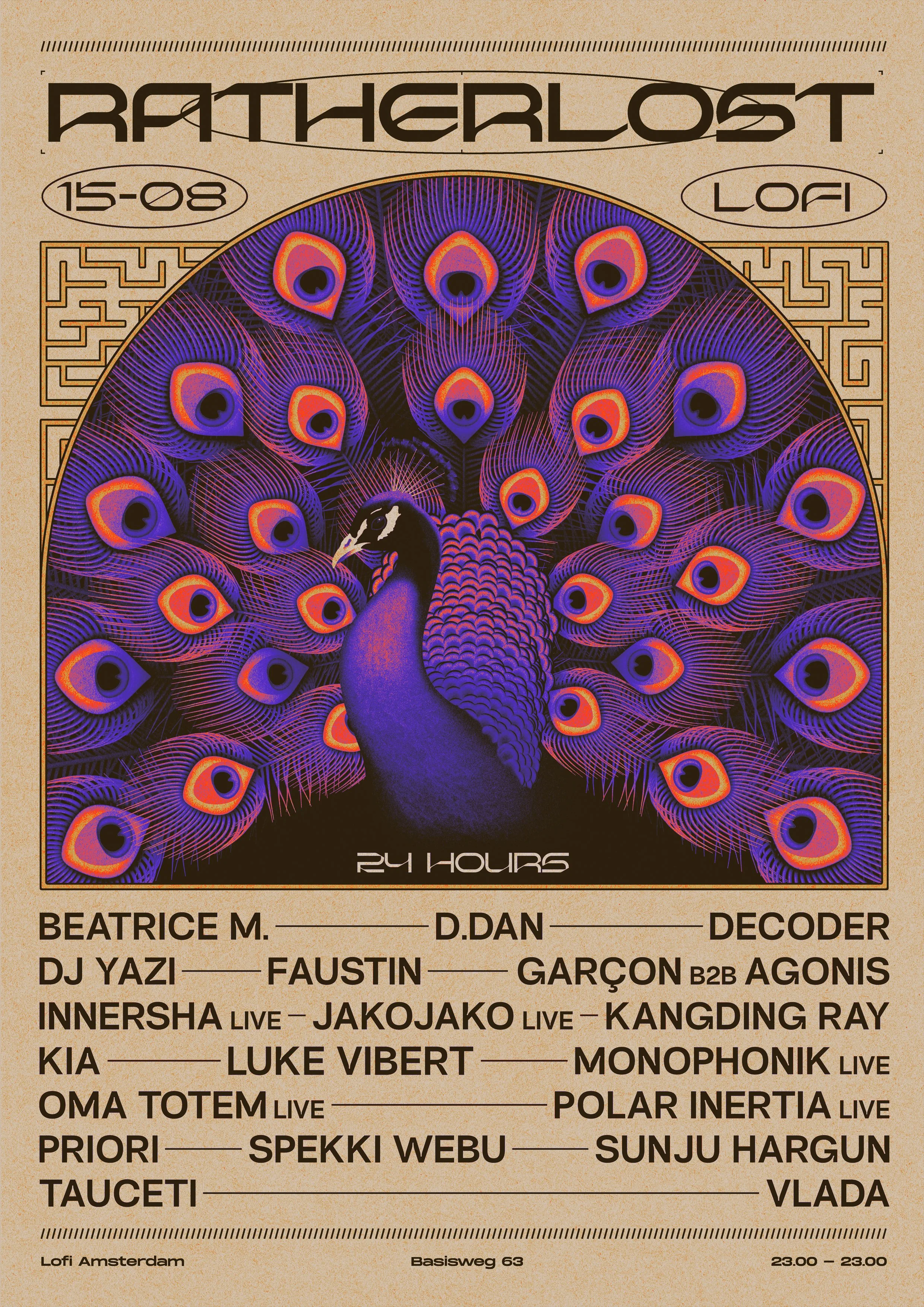 Celebrating the 20th Ratherlost gathering, we're going all out for the annual 24-hour midsummer ritual. A full planetary cycle unfolding across all Lofi dancefloors on August 15-16, transforming the whole venue into a vessel for exploration, exchange, and euphoria fueled by groundbreaking sounds 🦚